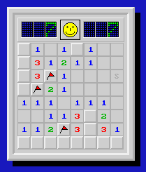 The minesweeper is a DOS-program written with Borland Pascal 7.0. For a complete screenshot click here. There exist a well known bug in the Unit crt.tpu from Borland Pascal 7.0, so that programs will not run on computers having processors faster then 200 MHz. I've found a bugfix and have compiled the Minesweeper with the patched version of Borland Pascal 7.0. Therefore the Minesweeper will also run on systems faster then 200 MHz, more. This minesweeper is very similar to minesweeper for Windows. But there are some differences:
