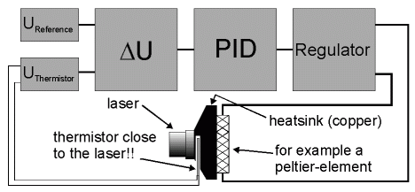 The reason to contruct a pid-regulator was to control the temperature of a laser diode. The laser diode I used for measurements during my phd-project had a temperature coefficient of about 0.3 nm/K. This means that the laser wavelength would increase by 0.3 nm if the temperature is increased by 1 K. Temperature dependent change in wavelebgth wasn't acceptable for my measurements. I not important here to describe the physical problems in detail. I only want to give a description of this regulator for somebody who has the same or a similar problem.