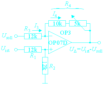 In the following it is assumed that all resistors are equal. The voltage at the non-inverting input of the amplifier is U+ = R2/(R1 + R2) * Uist = Uist/2. The current through the resistor R3 is I3 = (Usoll - U+)/R3. The current through the resistor R4 can be calculated in a similar way: I4 = (UD - U+)/R4 where UD is the output voltage of the amplifier. Because no current flow into the ampifier the following equation yields: I3 + I4 = 0. With R3 = R4 you get the equation 2U+ = Usoll + UD. With U+ calculated above the output voltage of the amplifier finally becomes UD = Uist - Usoll.